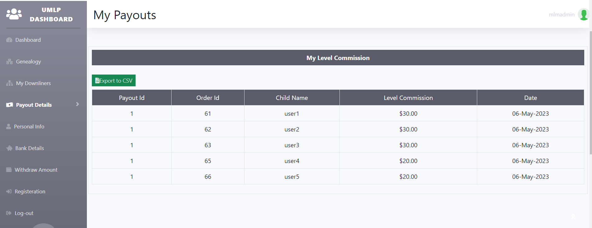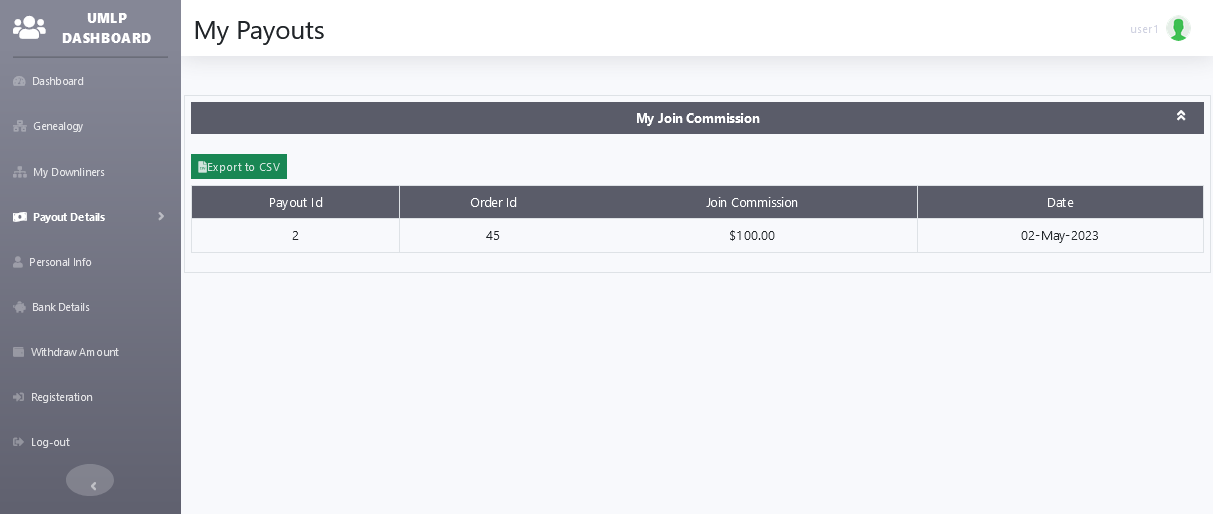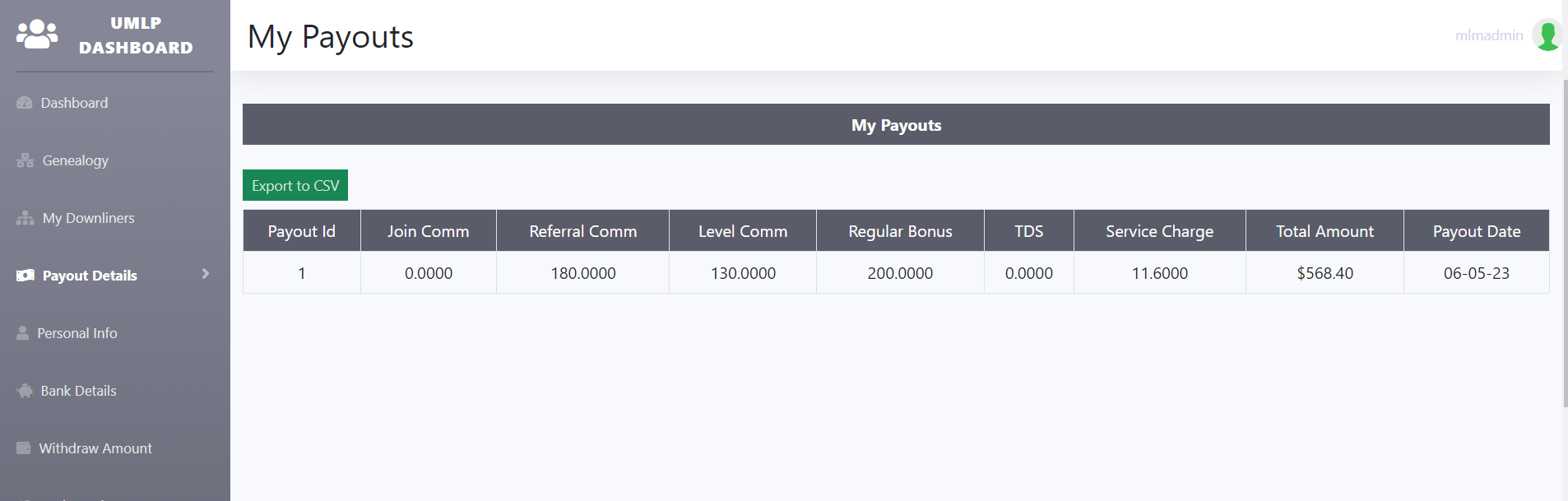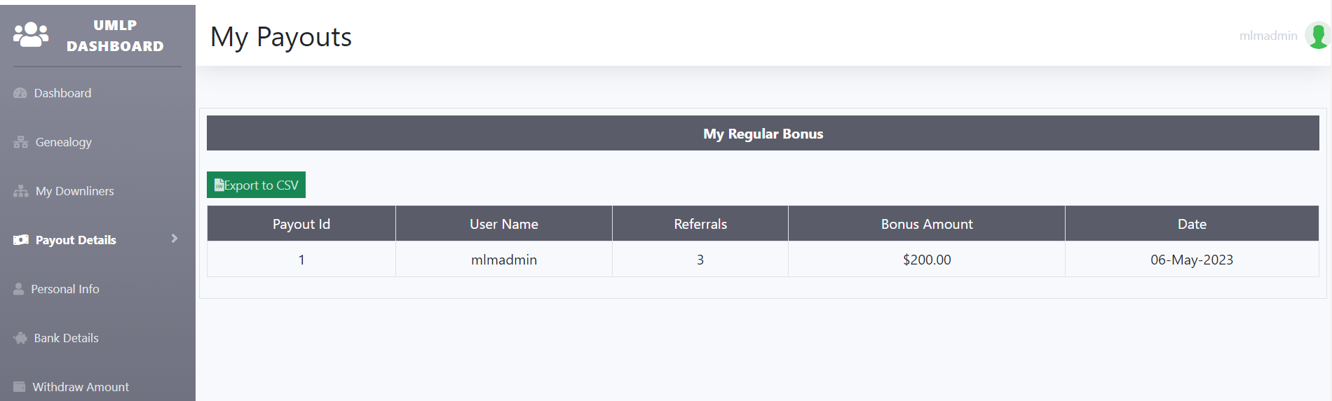 - Go to Unilevel MLM LearnPress --> Payout report. here you will see master payouts listing with total commissions, bonuses and deductions.