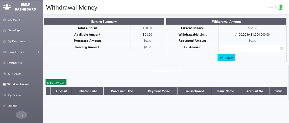 - withdrawal historyhere we have history of withdrawal, paid request, process request,initiate request.