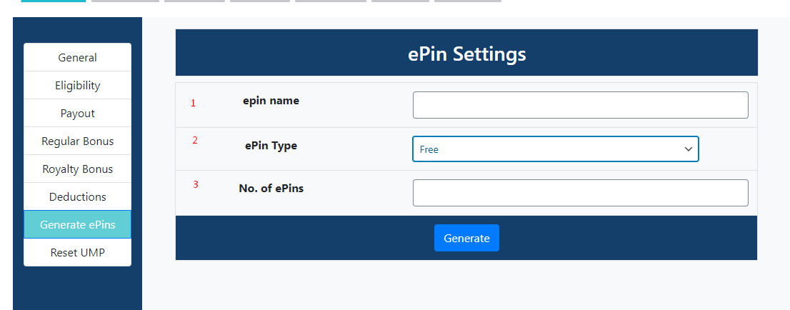 - E-pin type --> Select the e-pin type there are two type of e-pin free and paid, if you select paid then you will get another text box for e-pin price.