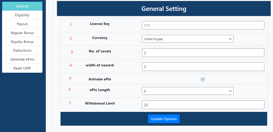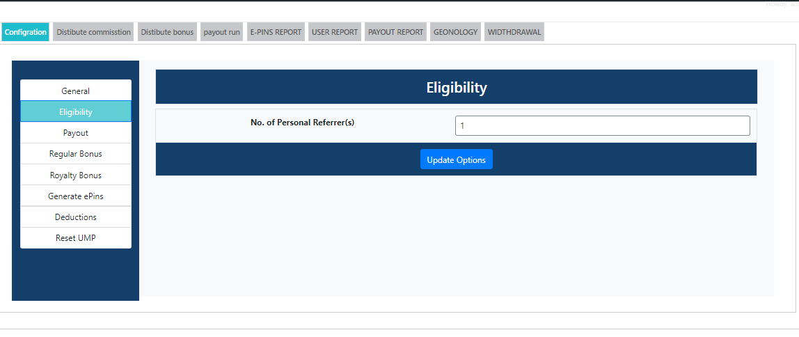 - No. of personal referral --> Enter the no. of personal referral for eligibility of user commission , suppose you enter 1 now if user add one direct referral then he is eligibale for commission, otherwise user will not get any type of commission.