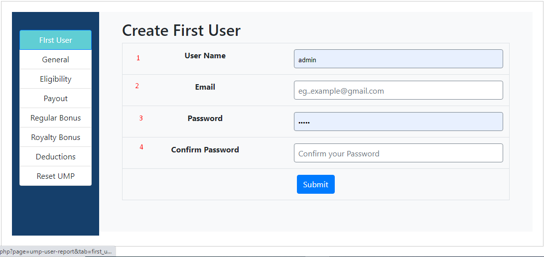 - Go to UMP Settings > Create first user, and create your first user.