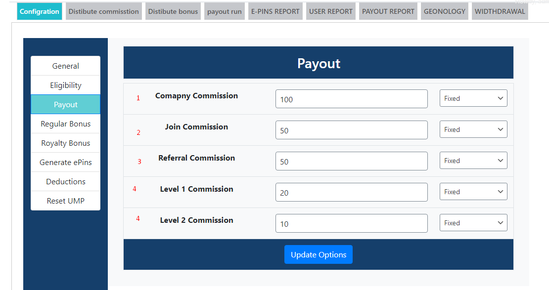 - Join commission --> Enter join commission amount in % or fix amount, this amount user will get at the the time of joining only once.