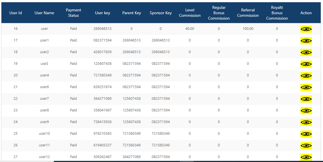 - Distibute bonus : Here you have the report of all users bonus >here you check how much royalty or ragular bonus user get.